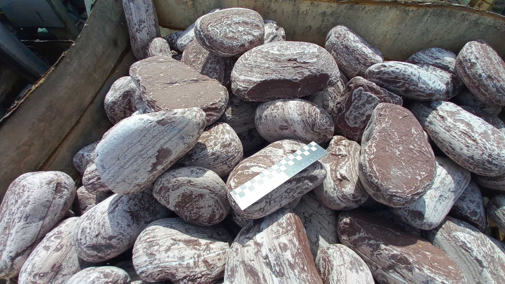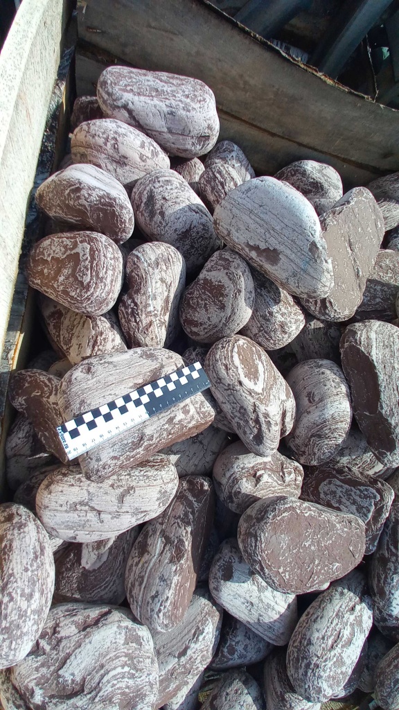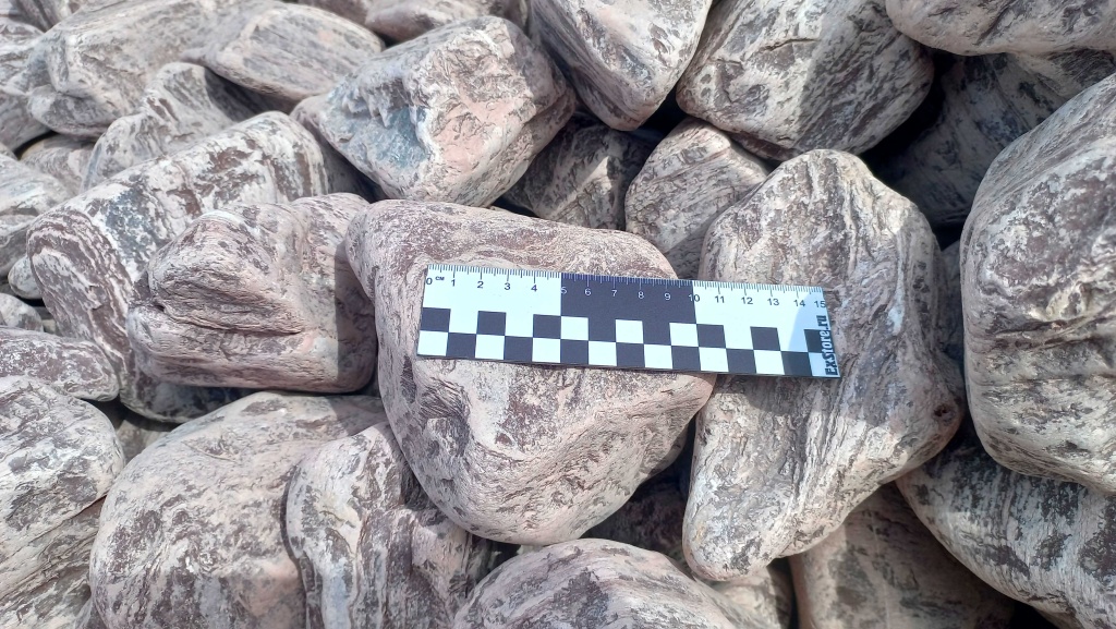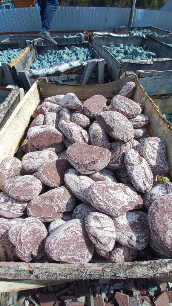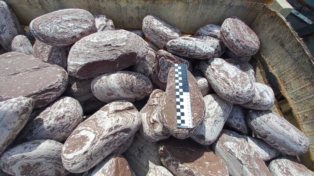 Лемезит галтованные ландшафтные валуны размером не более футбольного мяча. Цвет бордово-белый.
